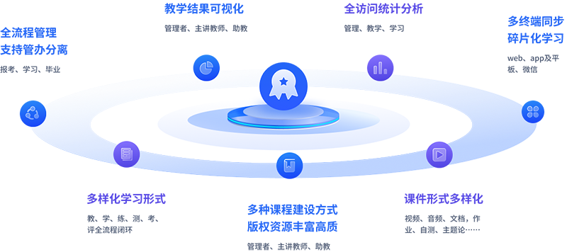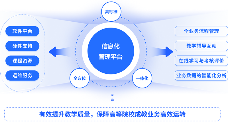 该方案从软件平台、硬件支持、课程资源、运维服务等方面,全方位一体化提供支持服务,高标准打造成教信息化管理平台,实现全业务流程管理、教学辅导互动、在线学习与考核评价,以及对业务数据的智能化分析,有效提升教学质量,保障高等院校成教业务高效运转。