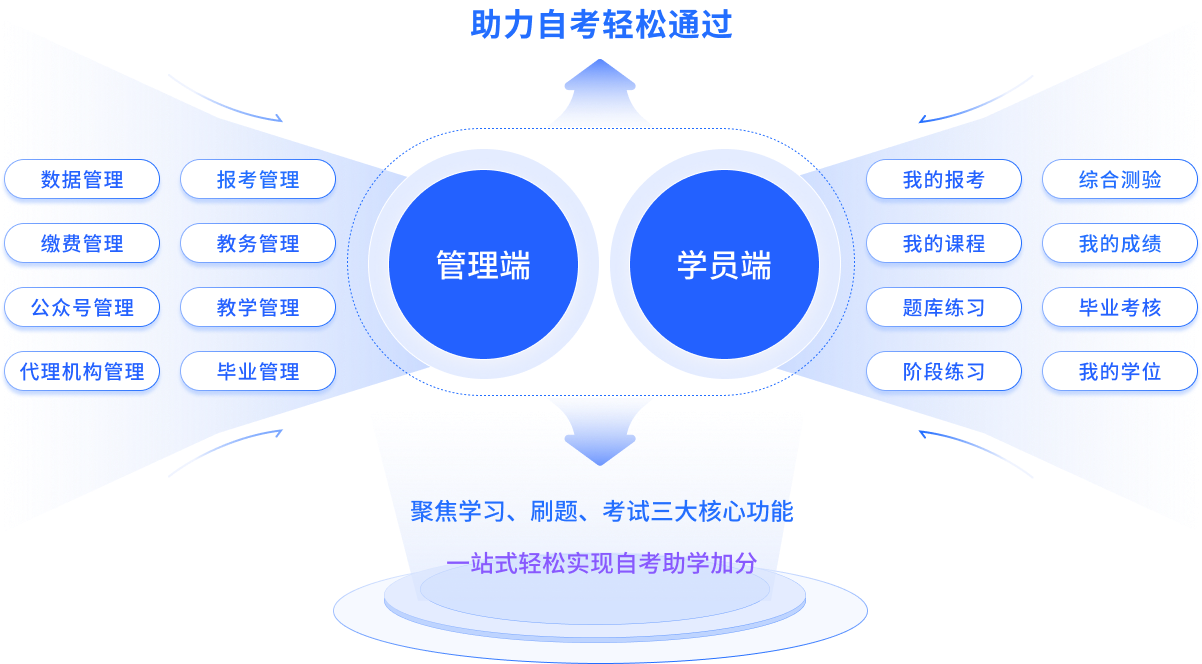 满足社会自考、全日制、二学历、专接本等不同办学形式的全流程管理。